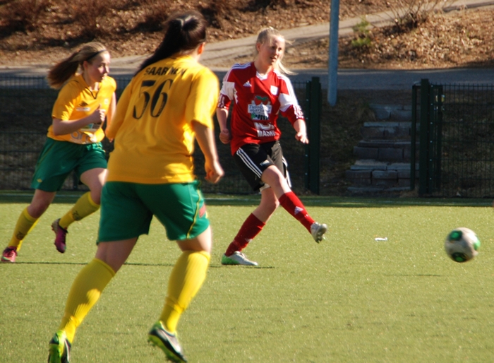 Kolme minuuttia myöhemmin kolisi kotijoukkueen maalin ylähirsi Tiina Saarion tykittäessä vapaapotkusta suoraan maalille.