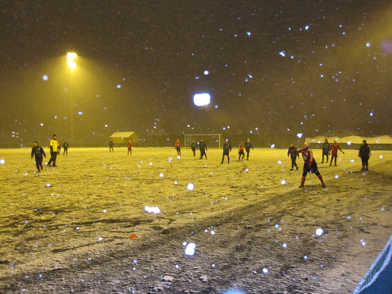 Ensimmäisellä puoliajalla palloa pystyttiin liikuttelemaan kentän keskivaiheilla molempiin suuntiin, mutta lumivaipan kasvattamaa palloa ei jaksanut kumpikaan joukkue maaliin saakka toimittaa maalivahtien värjötellessä kylmissään maaliensa edustoilla. Tänään Pyrkivän maalissa pelasi FC Interin poikien 97-joukkueen maalivahti.